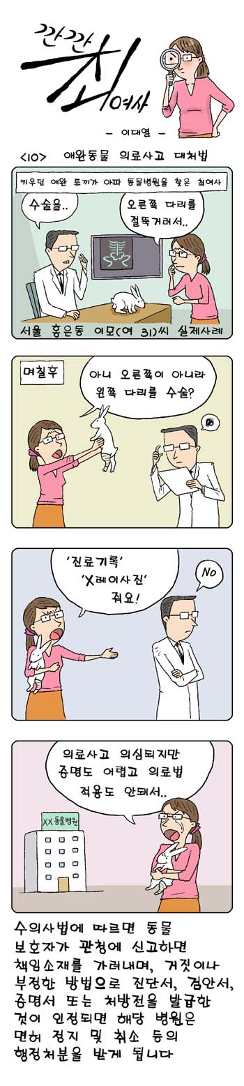 URL복사 기사공유하기 스크랩 프린트 메일보내기 글씨키우기 (이 만화 내용은 서울시 홍은동에 사는 이 모(여.31세)씨가 지난 11일 한 동물병원으로 키우던 토끼의 다리 수술을 의뢰했다 의료사고를 당한 실제사례입니다.) 저작권자 © 소비자가 만드는 신문 무단전재 및 재배포 금지 이대열 화백 다른기사 보기 URL복사 기사공유하기 주요기사 주병기 공정위원장, "총수 일가 부당한 지배력 확대 강력히 제재" 특징주 기사 이용한 선행매매로 112억 부당이득 챙긴 전직 기자 구속 경기도 통큰세일 의정부서 개막...김동연 지사 “올해 예산 3배 확대” 시세하락손해 보상, 출고 5년 이하에 수리비 차량가액 20% 넘어야 블프·코세페 등 할인 행사 몰린 11월, 택배 민원 54% 급증 넥슨, '2025 던파 페스티벌' 역대 최대 규모로 23일까지...대규모 겨울 업데이트 공개