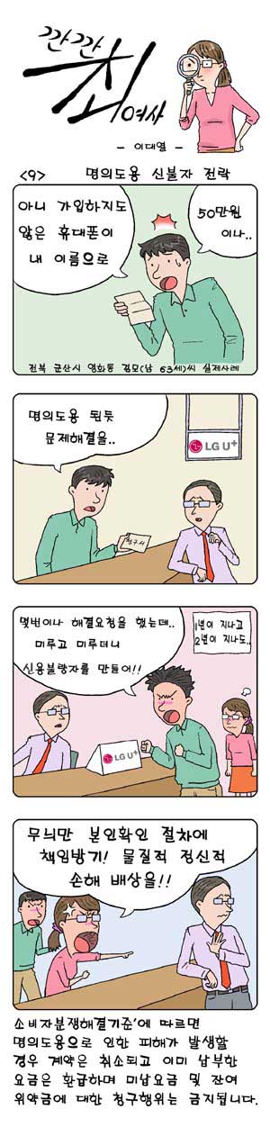URL복사 기사공유하기 스크랩 프린트 메일보내기 글씨키우기 (이 만화 내용은 전북 군산시 영화동에 사는 김 모(남.63세)씨가 지인의 휴대폰 가입 시 명의도용으로 인해 정신적, 물질적 피해를 본 실제사례입니다.) 저작권자 © 소비자가 만드는 신문 무단전재 및 재배포 금지 이대열 화백 다른기사 보기 URL복사 기사공유하기 주요기사 주병기 공정위원장, "총수 일가 부당한 지배력 확대 강력히 제재" 특징주 기사 이용한 선행매매로 112억 부당이득 챙긴 전직 기자 구속 경기도 통큰세일 의정부서 개막...김동연 지사 “올해 예산 3배 확대” 시세하락손해 보상, 출고 5년 이하에 수리비 차량가액 20% 넘어야 블프·코세페 등 할인 행사 몰린 11월, 택배 민원 54% 급증 넥슨, '2025 던파 페스티벌' 역대 최대 규모로 23일까지...대규모 겨울 업데이트 공개