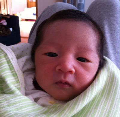 태어난 지 11일이 지난 라오는 똘망 똘망한 눈으로 사진기를 바라보며 이불에 감싸여 있다.