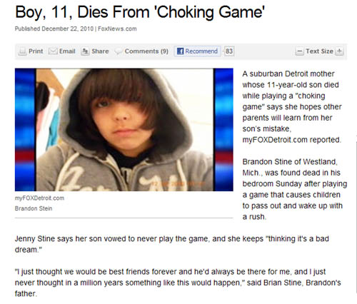 미국의 한 11세 소년이 '질식게임(choking game)'을 벌이던 중 사망한 것으로 나타나 충격을 주고 있다.