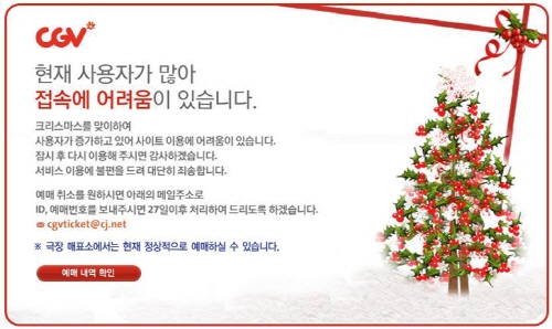 극장가 최대 성수기인 크리스마스를 맞아 영화를 관람하려는 사람이 몰리면서 멀티플렉스 CGV 홈페이지가 몇 시간째 접속 장애로 열리지 않고 있다. 때문에 온라인으로 영화를 예매하거나 변경하려던 소비자들이 불만을 호소하고 있다.
