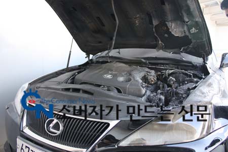 또 지난 7월엔 대구광역시에서 도요타 2007년식 렉서스 IS250 모델이 주행중 화재가 나 휴즈박스 전선이 다 타고 엔진룸 일부도 녹아내리면서 도요타 추산 2천여만원의 재산피해가 발생하기도 했다.<아래사진 참조>