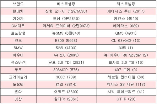 수입차 중에서는 벤츠의 E300이 5천663대를 팔아 1위에 올랐고 BMW의 528i가 4천793대로 뒤를 이었다. 도요타 캠리와 혼다의 어코드가 각각 3814대와 3390대로 3위와 4위를 차지했다.