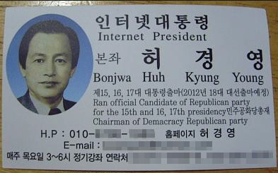 허영영의 명함에는 대통령 출마 이력과 공약, 저서, 음반 등 그의 다양한 활동내용이 담겨 있다. 또한 명함 상단에서 자신을 ‘인터넷 대통령’ ‘본좌’라 칭하고, ‘2010년 제18대 대선출마예정’이라고 적혀 눈길을 끈다.