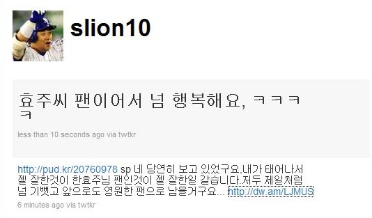 앞서 양준혁은 '해피선데이-1박2일' 방송을 통해 집안 곳곳에 한효주의 사진을 진열한 것이 공개됐다. 양준혁은 “한효주는 내 인생이 활력소”라며 애정을 드러냈다. 특히 이승기의 도움으로 한효주와 전화연결에 성공한 양준혁은 “효주 씨의 영원한 팬입니다”고 고백하기도 했다.(사진=양준혁 트위터)