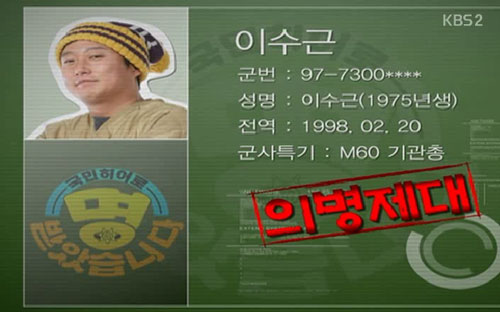 이수근은 1일 오후 첫 방송한 KBS 2TV 새예능프로그램 '명(命)받았습니다'에 출연, "십자인대 파열로 현역으로 군대를 갈 수 없는 상황이었다"고 밝혔다.