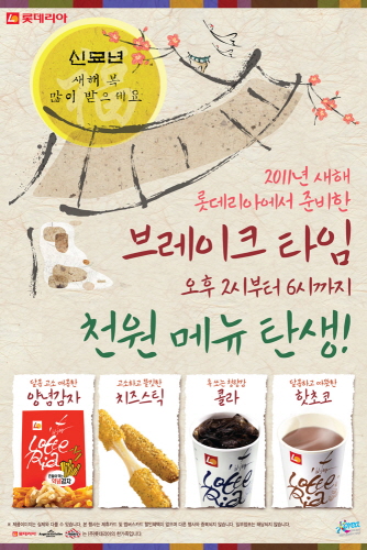 롯데리아(대표 조영진)가 2011년 신묘년을 맞아 인기 디저트인 치즈스틱, 양념감자, 핫초코, 콜라 등을 단돈 1천원에 판매한다.