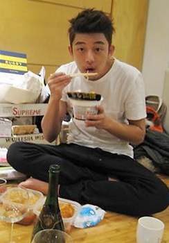 유아인은 지난 1일 자신의 미니홈피에 방바닥에서 컵라면 먹고 있는 자신의 사진을 게재했다.