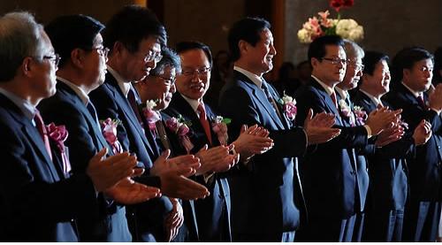 5일 오후 서울 중구 소공동 롯데호텔에서 열린 2011년 범금융기관 신년인사회에서 참석자들이 박수를 치고 있다. 사진 왼쪽부터 황건호 한국금융투자협회 회장, 신동규 은행연합회장, 한나라당 이종구 의원, 김중수 한국은행장, 김종창 금감원장, 윤증현 장관, 한나라당 허태열 의원, 김석동 금융위원장, 민주당 박병석 의원, 한나라당 이진복 의원.