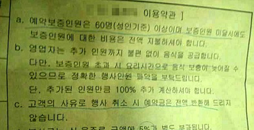 이에 대해 업체 관계자는 “대부분의 뷔페 및 웨딩업체에서는 행사일정 2개월 전에 계약을 취소할 경우 예약인원 대비 일정 위약금을 내도록 약관에 명시하고 있다. 다행히도 조 씨의 경우 행사 일정이 3개월 이상 남았기 때문에 위약금까지는 요구하지 않았다”고 주장했다.