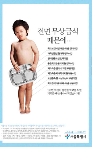 한편 이번 패러디는 지난해 뜨거운 관심을 받았던 ‘타진요’(타블로에게 진실을 요구합니다)를 패러디한 ‘무진요’(무상급식의 진실을 요구합니다)의 카페도 개설된 상태라 더욱 눈길을 끌고 있다.(사진=서울시의 무상급식 관련 광고)