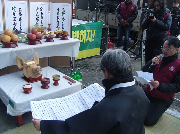 이어 축관을 맡은 김진배 사무처장이 맡아 축문을 읽어 내려갔다. 축문은 최근 몇 년간 건설현장에서 목숨을 잃은 건설노동자들을 추모하고, 앞으로 안전사고가 발생하지 않게 해달라는 기원을 담고 있었다.
