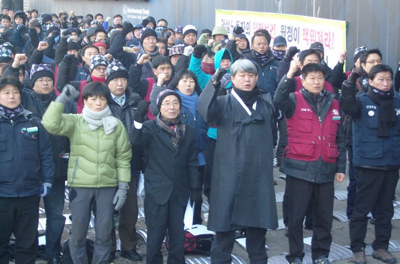 기자가 도착했을 당시 200여명의 건설산업연맹 회원들은 차가운 얼음바닥 아래, 담요도 아닌 은박 돗자리 위에 앉아 행사의 시작을 기다리고 있었다. 언제부터 나와 있었던 것인지 하나같이 코 끝이 빨개진 모습이었지만 이들의 표정에는 추운 기색이 묻어나지 않았다.