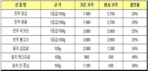 한우는 등심과 채끝(1등급)은 정상가 대비 24% 가량 할인된 5700원(100g)에 판매하며, 국거리·불고기(1등급) 역시 25% 가량 할인된 2900원(100g)에 판매한다.