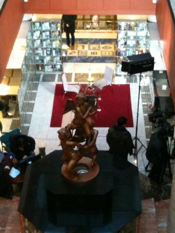김기욱이 찍은 사진은 납골당 2층에서 찍은 모습으로 촬영 준비로 분주히 움직이는 스태프들 사이에 검은색 옷을 입은 사람이 찍혀있다.