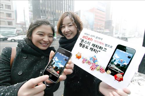 올레 캐치캐치 애플리케이션을 실행해 주변을 비추면 증강현실 화면에 몬스터 캐릭터가 나타난다.