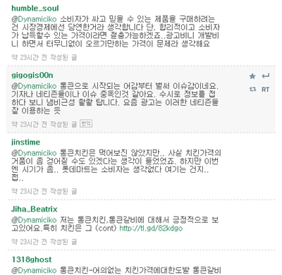 아이디 toktok74는 “통큰치킨 이후에도 내려가지 않은 치킨가격을 보니 치킨업계가 참 뻔뻔하다고 생각된다.롯데마트가 아니었으면 원가 문제를 꼬집지도 못했을 것”이라고 말했다. SJTLE는 "롯데가 좀 더 저렴하게 양질의 상품을 공급한다는 느낌이다. 부담스러웠던 치킨 가격을 내려 대중화해야한다는 생각"이라고 찬성했다.
