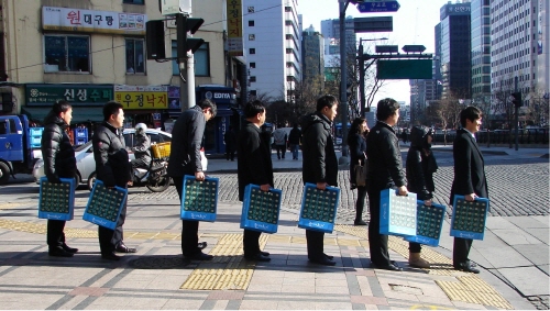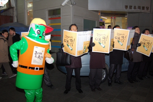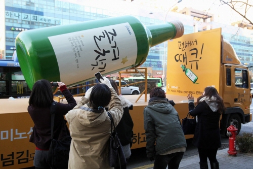 진로 직원 150여명은 작년말부터 ‘즐겨찾기’ 종이상자 제작물을 들고 단체 보행하는 퍼포먼스를 펼쳐 눈길을 끌고 있다. 마치 소주박스를 들고가는 듯한 착시현상을 유도해 행인들의 시선을 유도하는 것이다.