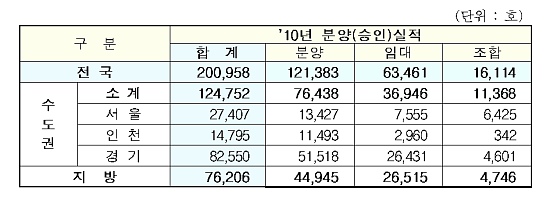 13일 국토해양부는 이 같은 내용을 담은 '2010년 분양(승인)·준공실적' 자료를 발표했다.