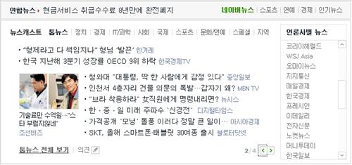 기존에 좌측에 위치했던 언론사 목록을 우측으로 이동하고 주제별 보기를 상단에 위치시켜 이전처럼 탭을 선택하지 않고 클릭 한번으로 원하는 주제와 언론사로 바로 옮겨갈 수 있도록 구성했다.