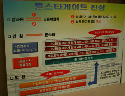 김 교수는 론스타 게이트 내막에 대해 "한마디로 감사원이 지난 2007년 3월 12일 외환은행 승인취소를 권고한 사안"이라며 "검찰은 2006년 12월 '중간' 수사결과 이후 아직까지 해외도피 중인 론스타 주범 3인이 수사에 불응하고 있고 증거 불충분을 이유로 최종수사 결과를 발표하지 않는 등 반쪽짜리 수사에 머물고 있다"고 비판했다.