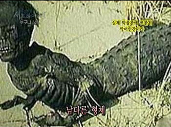 방송에 따르면 미국 롱비치의 머시즈 프리 박물관에는 몸길이 130㎝의 악어인간 미라가 전시돼 있다. 이 악어인간을 두고 일각에서는 박물관에서 인기를 끌기 위해 미라를 조작했다는 의혹을 제기하고 있다.