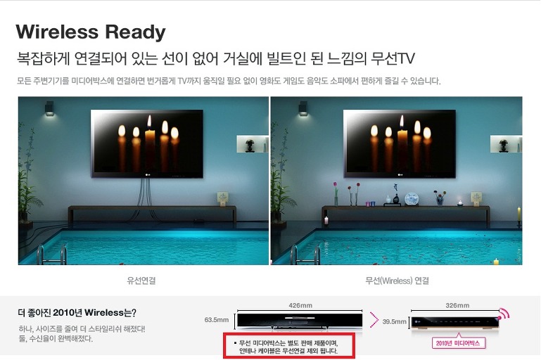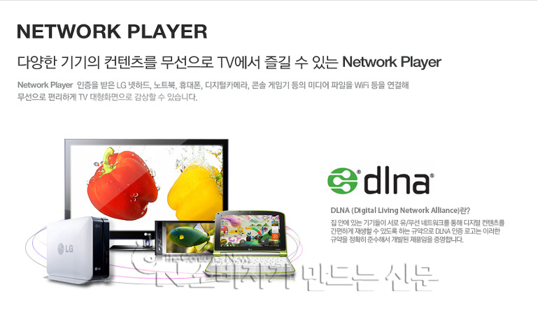 홈페이지에 게재된 제품 팸플릿에는 'Network Player 인증을 받은 LG넷하드, 노트북, 휴대폰, 디지털카메라, 콘솔 게임기 등의 미디어 파일을 WiFi 등을 연결해 무선으로 편리하게 TV 대형화면으로 감상할 수 있습니다'라고 쓰여 있었다.