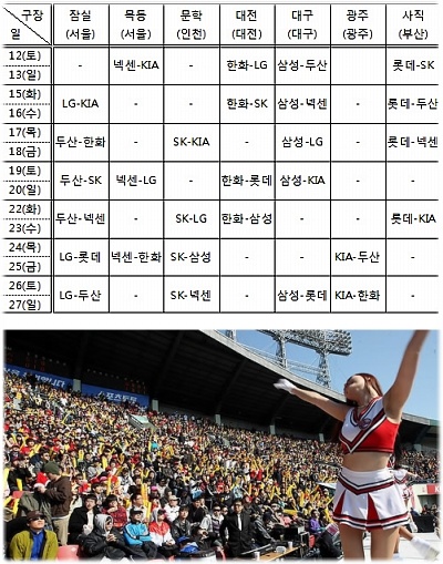 올해 프로야구 시범경기는 팀간 2차전, 팀 당 14경기, 총 56경기를 거행한 후 3월27일에 종료된다.