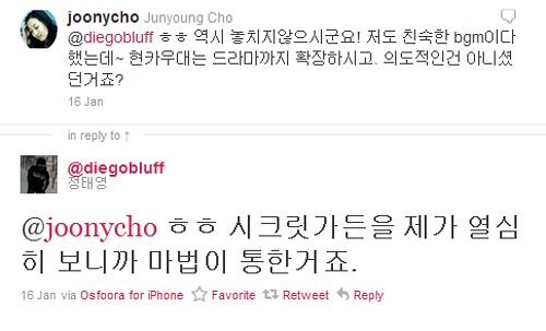 역시 자신의 트위터를 통해 "시크릿가든 다음프로인 신기생뎐 광고는 현대카드 BGM을 쓰네요. 기생집에서 현대카드 우대하나봐"라는 우스갯소리를 남겼고, 이에 팔로우들이 각각의 반응을 보인 것이다.