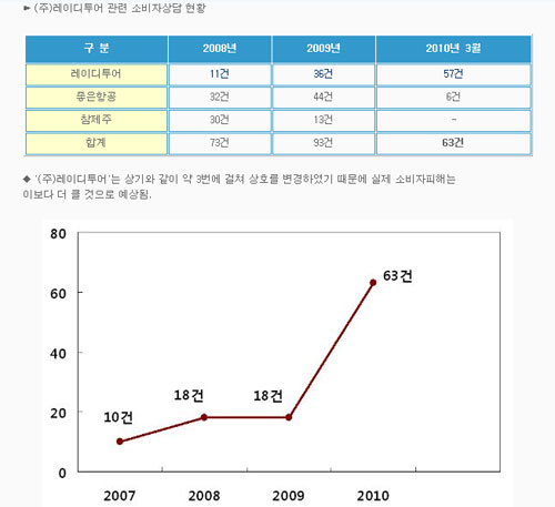 한국소비자원에는 ‘레이디투어’에 의한 피해가 2008년 73건, 2009년 93건 접수되어 있다. 게다가 ‘레이디투어’는 ‘참제주’, ‘좋은항공’으로 업체명을 바꿔가며 영업을 했기 때문에 실제 피해사례는 더 많을 것이라고.