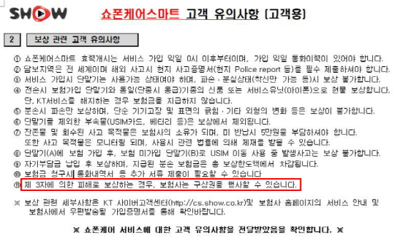 이에 대해 KT 관계자는 "쇼폰케어 가입시 소비자와 당사가 함께 확인 후 작성하는 '고객 유의사항' 항목 중에는 제3자의 피해로 보상하는 경우 보험사는 구상권을 행사할 수 있다는 항목이 있다"며 "적은 금액의 보험이지만 차량 보험 등과 마찬가지로 구상권이 적용되는 것에 대해 유의해야 할 것"이라고 설명했다.