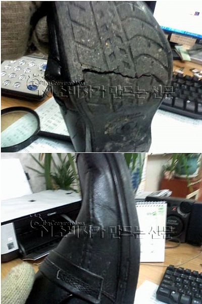 착용 2주후, 박 씨는 황당한 경험을 했다. 출근 길에 착용한 구두바닥이 비가 새고 있었기 때문. 구두 밑을 살펴보니 곧 두동강이 날 듯 심하게 갈라진 상태였다.