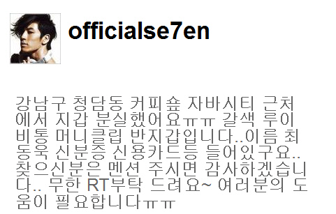 세븐은 21일 자신의 트위터에 ‘서울 강남구 청담동 커피숍 자바시티 근처에서 지갑을 분실했어요. 갈색 루이비통 머니클립 반지갑입니다. 이름 최동욱 신분증 신용카드 들어있고요. 찾으신 분은 멘션 주시면 감사하겠습니다. 무한 RT 부탁드려요. 여러분의 도움이 필요합니다’라는 내용의 글을 게재했다.