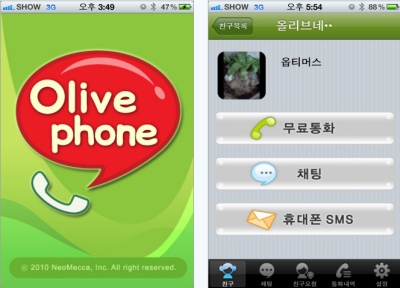 '올리브폰'은 아이폰과 안드로이드폰 모두에서 사용가능한 앱으로 안드로이드에서 큰 인기를 모았던 '카카오톡과' 아이폰 전용 '바이버'의 장점을 모두 모았다는 게 특징이다.