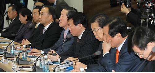 이날 회의에는 이 대통령을 비롯해 이건희 삼성전자 회장, 정몽구 현대차그룹 회장, 최태원 SK그룹 회장, 구본무 LG그룹 회장 등 주요 그룹 회장과 정병철 전경련 상근부회장, 손경식 대한상공회의소 회장, 사공일 무역협회 회장 등 29명이 참석했다. [biz&ceo뉴스/소비자가 만드는 신문=양우람 기자]