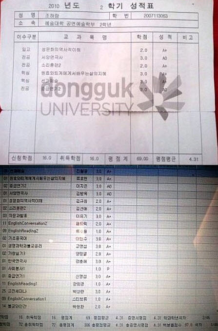조하랑은 27일 자신의 미니홈피에 “지난학기 성적표가 도착했다. 정말 학교만 다니면서 공부만 했던 1학기에는 올A+수석. 이번 2학기는 욕심은 버렸다”며 우월한 성적표를 공개했다.