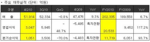 연간 영업이익은 2조 533억원으로 전년대비 117% 증가했으며, 2009년말 반영된 특별 명예퇴직비용을 제외하더라도 전년대비 13% 증가한 수치이다. 순이익은 전년대비 93% 증가한 1조 1,719억원이다.