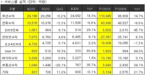 KT(회장 이석채 www.kt.com)는 28일, 2010년 4사분기 실적과 연간실적을 발표했다.