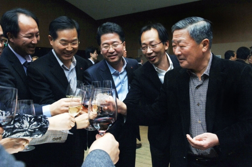 <사진설명= 구본무 회장(맨 오른쪽)이 LG 신임 임원 축하 만찬에서 신임임원들과 건배하고 있는 모습>