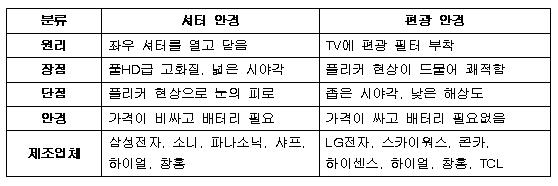 삼성전자가 채택한 셔터 안경 방식은 화면에서 보내는 영상 신호와 입체 안경의 동기화를 통해 셔터를 열고 닫으며 입체감을 주는 방식이다. 화질이 뛰어나지만 상대적으로 약간 어둡고 입체안경 가격도 비싸다.