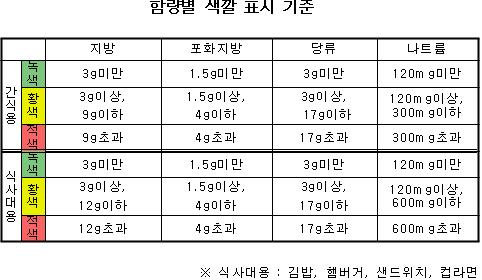 이에 따라 어린이기호식품 중 신호등 표시제 대상이 된 제품은 가공식품 전체가 됐다. 가공식품 중 과자, 빵, 초콜릿, 가공유, 아이스크림, 어육소시지, 컵라면, 과채주스, 포장판매하는 김밥, 햄버거, 샌드위치는 지방, 포화지방, 당, 나트륨 성분을 표시해야 한다.