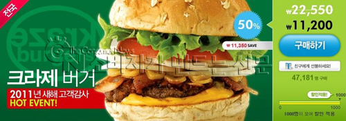 9일 경기도 남양주 진잡읍에 사는 이 모(여.28세)씨에 따르면 지난 1월 소셜커머스 쿠팡에서 2만2천원 상당의 크라제 버거 이용권을 50%할인된 1만1천원에 구입했다. 다른 쿠폰과는 달리 자신이 지정한 지점에서만 사용할 수 있는 조건이었다.