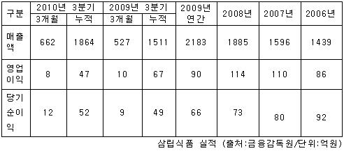 삼립식품은 지난해 3분기 영업이익 47억원을 기록했다. 전년 동기대비 20억원이나 쪼그라든 수준. 작년 한 해 동안의 영업이익도 2009년(90억원)보다 떨어졌을 것으로 전망되고 있다. 당기순이익 역시 5년 전 92억원에서 작년에는 60억원대 수준으로 떨어졌을 것으로 추산되고 있다.