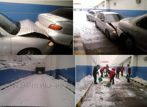 연이은 폭설과 한파로 도로가 꽁꽁 얼어 붙으면서 제설작업이 제대로 이뤄지지 않은 대형마트 주차장 진입로에서 3중추돌 사고가 발생했다. 현재 소비자와 업체 측은 보상에 대한 의견의 폭을 좁히지 못해 분쟁 중이다.