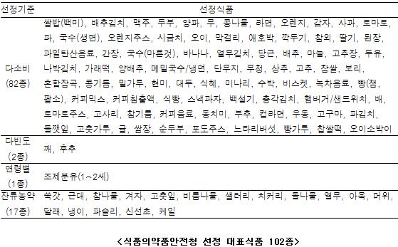 이번 조사는 소비자들이 가정에서 실제로 섭취하는 밥, 국, 반찬 등 대표식자재 102종의 원재료 또는 가공재료를 사용해 총 98종의 잔류농약 검사를 실시했다.