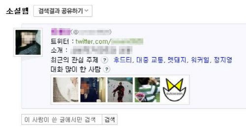 관련 드라마에 관심 있는 사람이라며 5명의 사진이 올라왔고 그 중 하나의 사진을 클릭했더니 그 사람의 이름, 트위터 아이디, 최근의 관심주제 등의 개인정보부터 그와 대화 많이 한 사람까지 몽땅 검색됐기 때문이다.