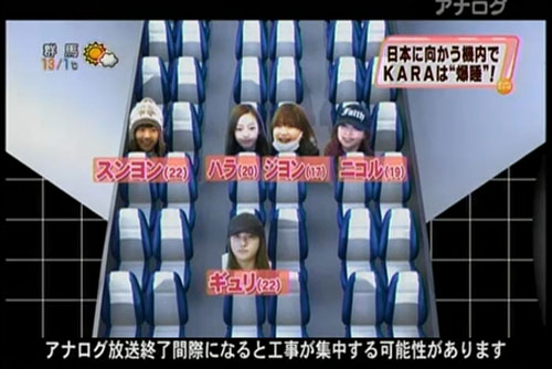 3일 일본 후지TV는 ‘카라 5인 촬영현장직격’이라는 이름으로 드라마 ‘우라카라’ 촬영 차 일본행 비행기를 탄 카라 멤버들의 비행기 내 좌석배치도를 공개했다.