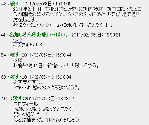 지난 6일 해당 커뮤니티 게시판에 "2월11일 오후 21시 신주쿠역에서 살인사건할 것"이라고 게재했다. 이어 "꼭 실행할 것이다. 아키바보다 더 많은 사람 죽을 것이다"라고 글을 올렸다.