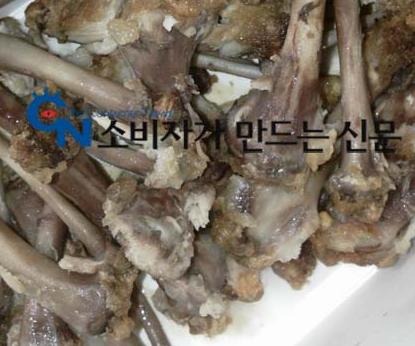 유명 브랜드 치킨점에서 구입한 닭뼈가 시커멓게 변색돼 소비자가 불쾌감을 호소했다. 소비자는 일반적으로 냉동된 닭을 사용할 경우 뼈가 변색되는 점을 들어 수입산이 아니냐는 의혹도 제기했다. 국내산 닭은 대부분 냉장상태로 유통되고 수입산의 경우 냉동 유통되기 때문이다.