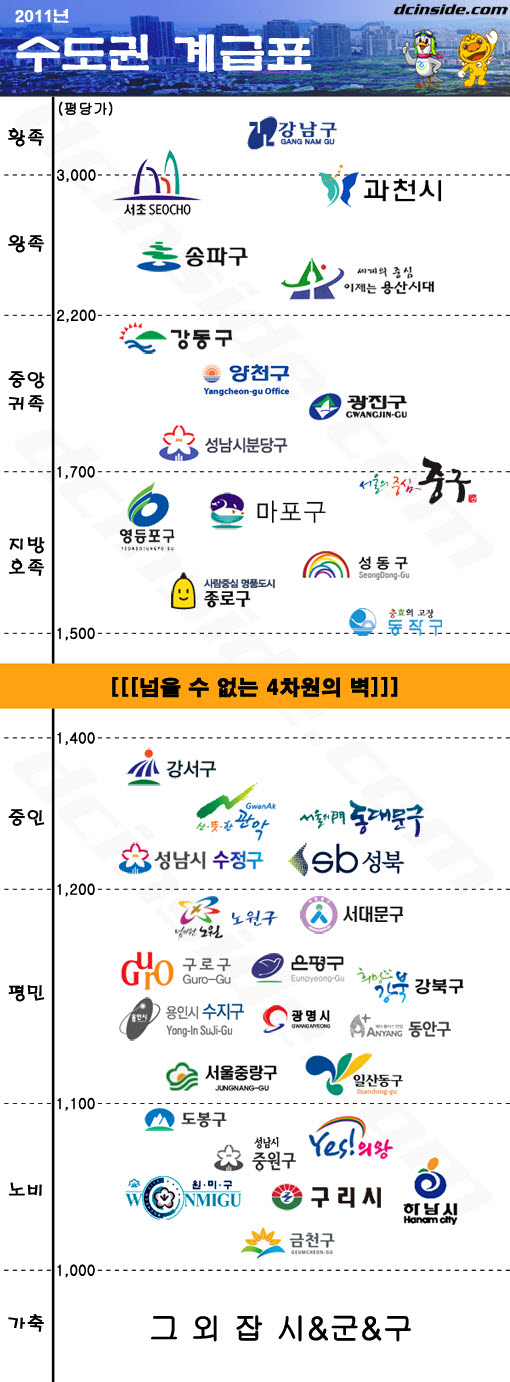 2월11일 디시인사이드 부동산 갤러리에는 거주하는 지역의 땅값 순서대로 거주자의 신분계급을 매겨 놓은 '2011 수도권 계급표'가 올라왔다.